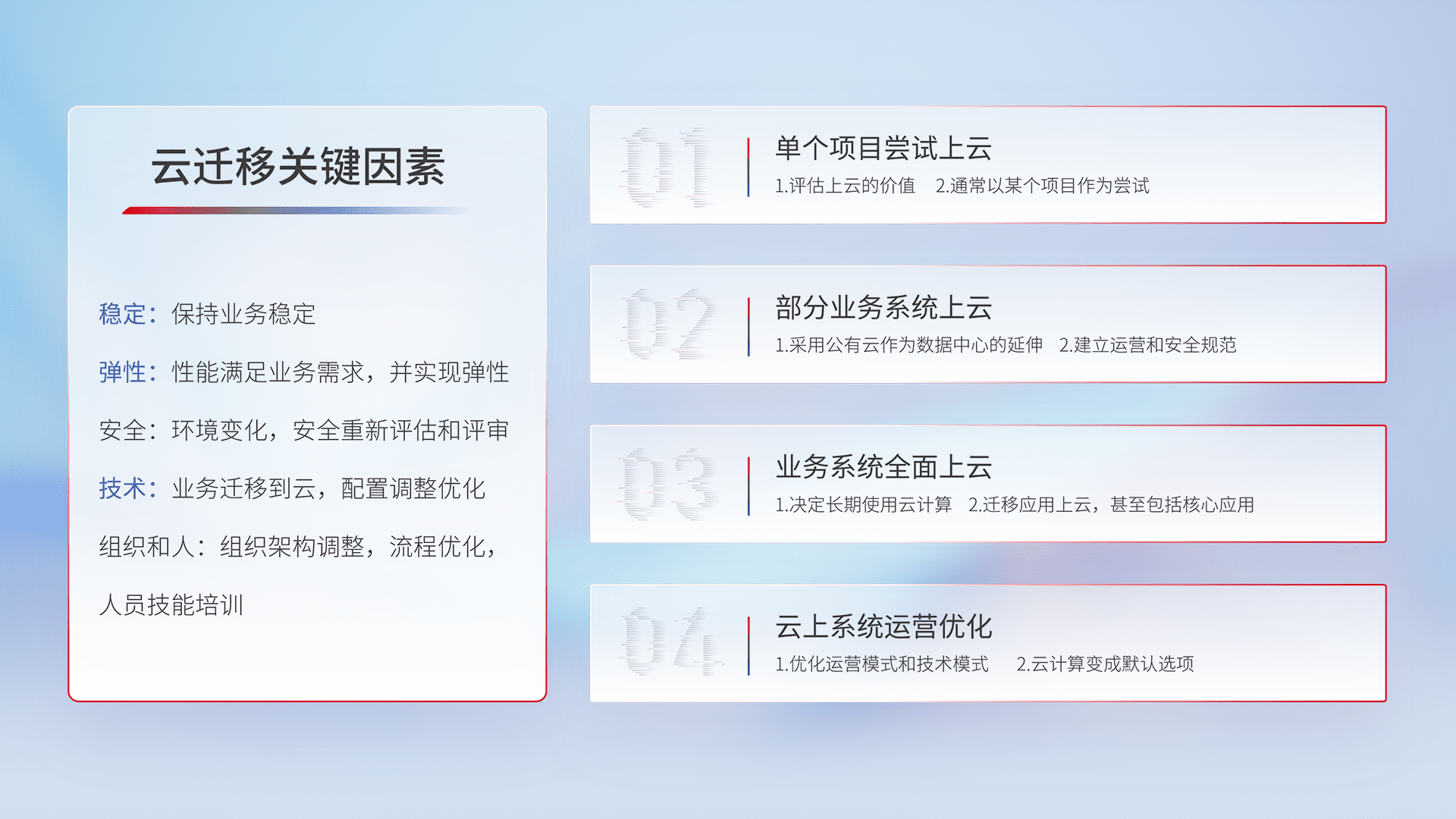 结合实际业务,,,从规划设计、、、、云平台选型、、、、云原生改造、、、数据迁移、、、、集成交付,,迁移全过程为客户识别最佳上云路径,,做好风险识别管理,,,设计网络架构、、身份权限、、、安全审计合规、、、操作审计、、、日志审计、、、、监控告警策略、、多站点容灾设计等,,对云上基础设施进行整体规划,,提升IT治理水平,,以满足弹性、、、、高可用、、、高性能的需求。。。