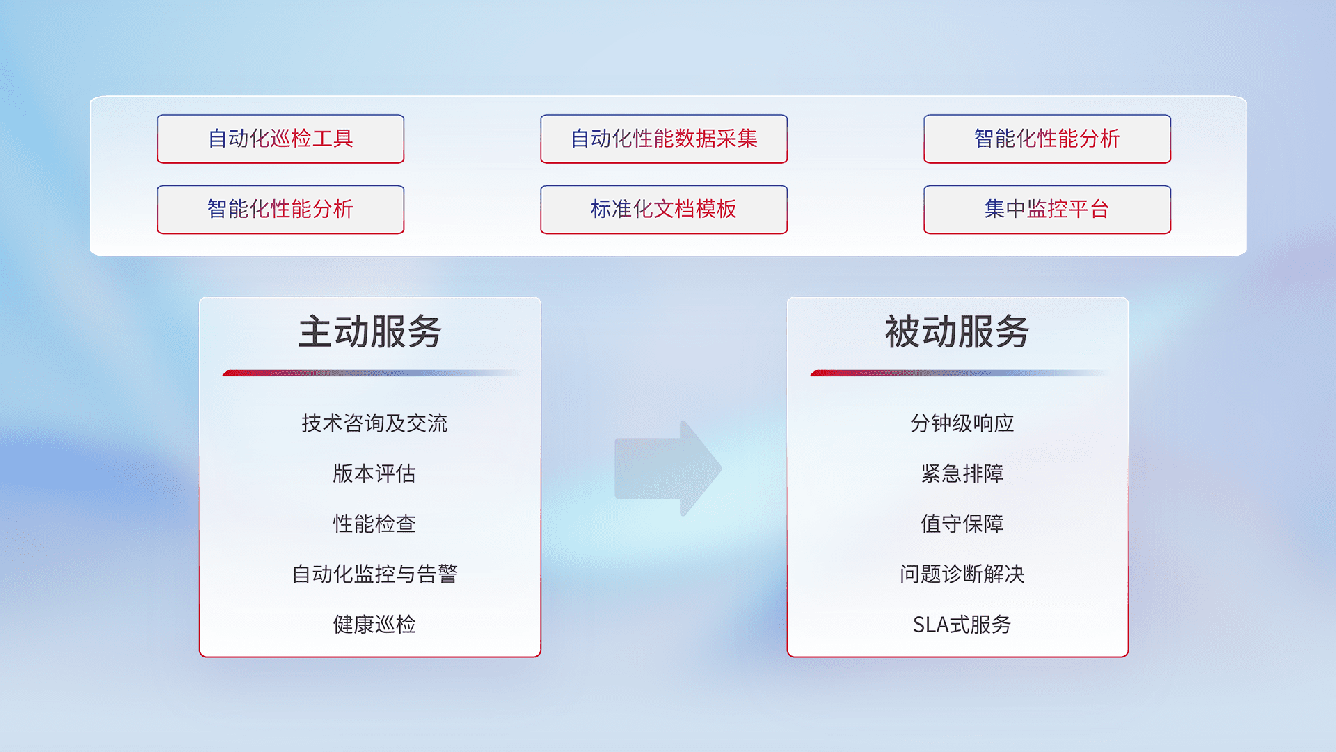 智能化工具和标准化文档,,,,保障服务质量,,,提供主动服务(包含技术咨询、、、、版本评估、、性能检查、、自动化监控与告警、、、、健康巡检)和被动服务包含(分钟级响应、、紧急排障、、、值守保障、、问题诊断解决、、、SLA服务)。。。